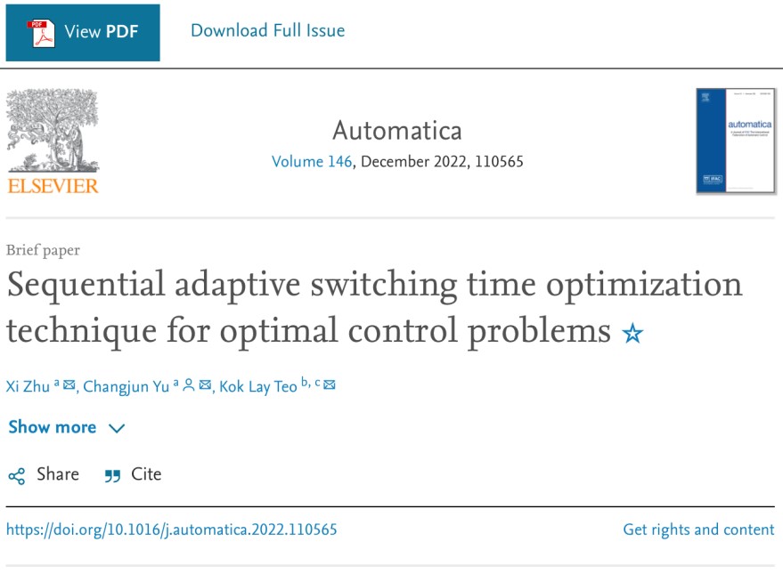 近日,数学系余长君副教授团队在最优控制领域的研究取得突破性进展,相关成果“Sequential Adaptive Switching Time Optimization Technique for Optimal Control Problems”发表于自动化领域国际顶级期刊《Automatica》,永利集团88304官网为第一作者和通讯作者单位。