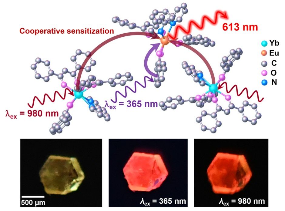 近日,永利集团88304官网化学系孙丽宁教授团队设计了一种由单核Yb3+配合物作为敏化剂和单核Eu3+配合物作为活化剂的上转换发光共晶聚集体。在980 nm近红外光的激发下,Yb3+- Yb3+离子对吸收光子后,以协同敏化上转换的方式传递给Eu3+离子,实现了Eu3+的红色上转换发光,同时其在365 nm的紫外光激发下,也能够获得Eu3+离子的红色下转移发光。该团队进一步探索了不同比例的分子组合对发光的影响,当Yb3+:Eu3+的摩尔比为1:1时其发光强度最强,在980 nm光激发下(2.1 W/cm2),展现出了0.67±0.03%的上转换发光量子产率,这比相同分子水平的Yb/Tb离子对高出约100倍。该团队进一步对共晶聚集体的结构和能量传递机理进行了系统的表征和讨论,创新性地实现了稀土配合物在非氘化溶液中的室温上转换发光。