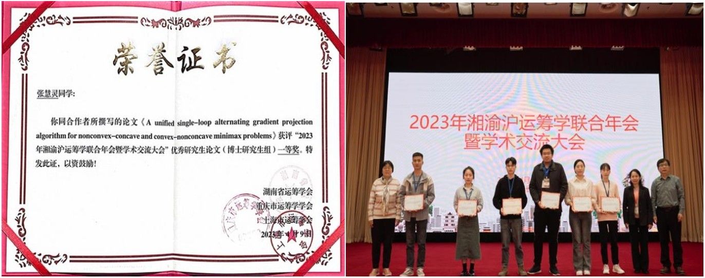 2021级博士生张慧灵为该论文第二作者,并凭此工作于2023年4月9日获得2023年湘渝沪运筹学联合年会暨学术交流大会优秀研究生论文(博士研究生组)一等奖。