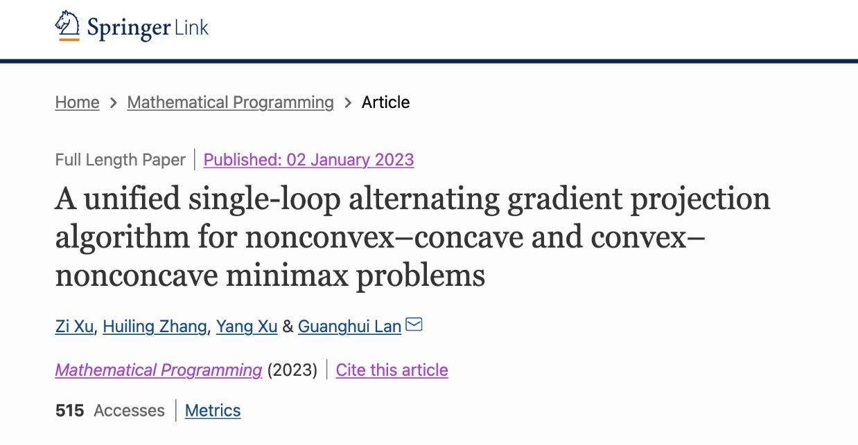 近日,数学系徐姿教授团队及其合作者在非凸极小极大优化问题的优化算法领域取得重要进展,相关研究成果以“A unified single-loop alternating gradient projection algorithm for nonconvex–concave and convex–nonconcave minimax problems”为题发表于国际运筹优化顶级期刊《Mathematical Programming》(中科院一区Top,中国数学会T1期刊,运筹优化领域国际三大顶级期刊之一)。该论文徐姿教授为第一作者,永利集团88304官网为第一署名单位。
