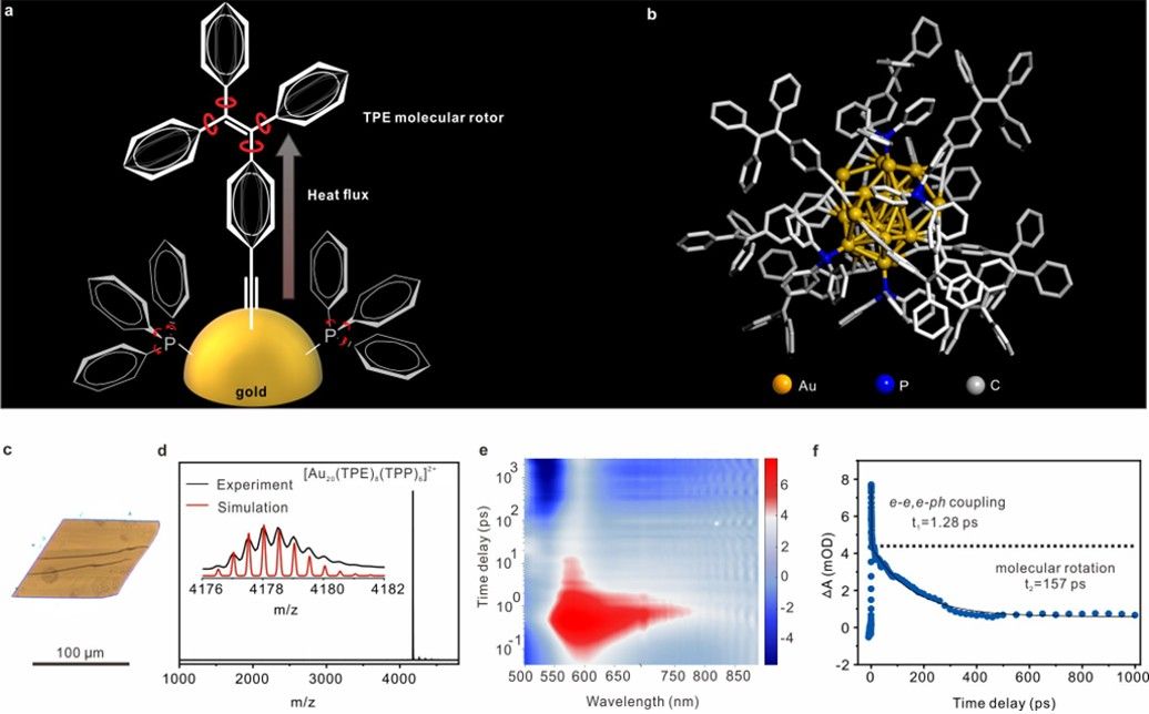 为了克服这一挑战性问题,研究团队通过纳米界面分子工程技术调控Au NCs纳米颗粒的界面热传导率。通过将螺旋桨状、可自由旋转的分子转子TPE配体锚定到Au NCs的表面,设计了一种具有原子精度的光热金纳米机器。在构建的纳米机器结构中,金核吸收光子,激活自由电子,电子-声子耦合促进界面热传输;而界面的TPE配体通过主动耗散将金核产生的热量耗散到溶液中。通过这一策略,成功构建了超稳定的光热纳米机器,并将其成功应用于肿瘤光热治疗。