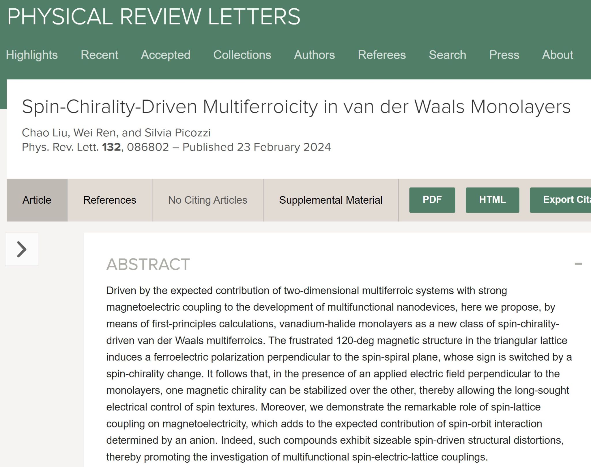 Spin-Chirality-Driven Multiferroicity in van der Waals Monolayers, Chao Liu, Wei Ren, and Silvia Picozzi, Phys. Rev. Lett. 132, 086802, 2024.