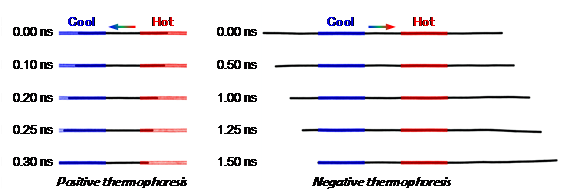 自1856年Ludwig首次发现液体中的正热泳现象(液体中的微粒自发朝低温方向运动)以来,热泳在医药、生物、能量转换等领域得到了广泛的应用。1967年,Dwyer理论预测了液体中的负热泳现象(微粒在某些情况下自发朝高温方向运动)。尽管液体中的热泳规律及其机理研究取得了许多重要进展,固体间的热泳现象却很少有人关注。直到2006年,Schoen等人(Nano Lett)才通过分子动力学模拟在同轴碳纳米管的相对运动中发现了固体间的热泳运动,该现象迅速得到Barreiro等人的实验证实(Science,2008)。但是,固体间是否也存在负热泳现象目前为止没有人报道过。冷建涛等人运用分子动力学模拟方法,预测了固体间的负热泳运动。