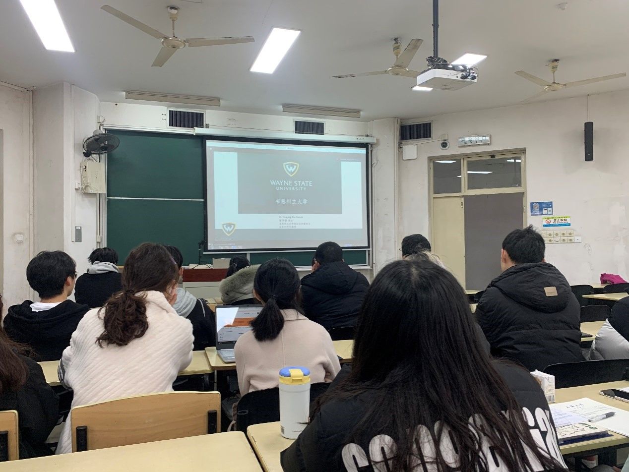2023年2月17日上午,在永利集团官网宝山校区DJ108多媒体教室举行了永利集团88304官网-美国韦恩州立大学文永利集团88304官网应用化学“3+2”合作教育项目的宣讲会。来自美国韦恩州立大学国际合作副校长修华静,永利集团88304官网党委书记盛万成、党委副书记副院长姚颖冲、副院长郭聪(挂职)、化学学科党总支书记邢菲菲、化学系主任李健、副主任洪玲、孙丽宁、化学学科党总支副书记胡研及化学系线上线下共计50余位学生出席了本次宣讲会。