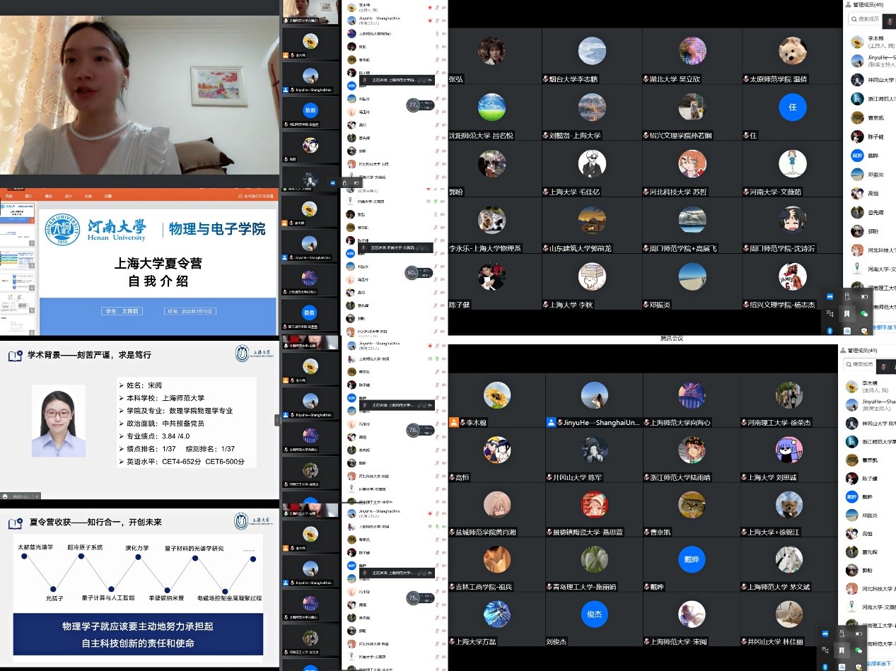在葛先辉教授的主持下,在校优秀研究生代表与营员们进行了考研和在校经历分享。营员们也就报考事宜和毕业就业等进行了踊跃提问和信息咨询。夏令营期间,从学生出勤、活动情况、个人风采展示多个方面进行考核,由老师们投票,评选出了20位优秀营员,并线上颁发了优秀营员证书。至此,2022年永利集团88304官网物理系夏令营圆满落幕。