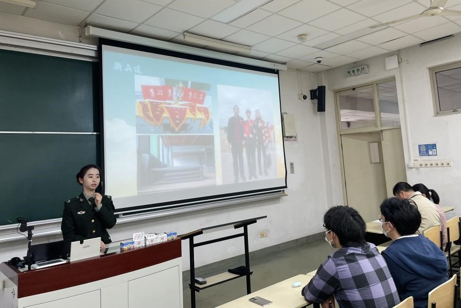 接下来,退伍学生代表董竹同学从军旅生涯、入伍期间的难忘经历展开分享。她在本科期间曾两次报名参军入伍,于2019-2021年服役于中国人民解放军东部战区陆军某部队,期间获优秀士兵嘉奖。董竹同学首先播放了一段超燃的短视频,带领同学们领略了部队军人的飒爽英姿和独特的精神风貌。随后,她从部队活动,日常作息,成长收获等方面详细介绍了她在军队中所学到的知识和经历的各种锻炼,以及由此获得的丰富人生阅历,以此鼓舞同学们积极参军入伍,勇敢接受挑战,线上和线下的同学们都受益匪浅。