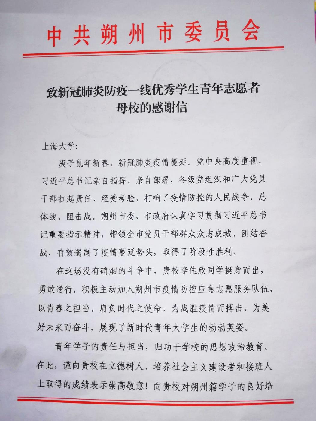 作为一线抗击疫情的志愿者,李佳欣没有告诉老师,也没有告诉同学,她说是因为害怕大家为她担心,直到疫情将近结束,她才告诉自己的辅导员老师:疫情期间她去做了一名的志愿者,同时请辅导员老师把一封感谢信转交给学校。