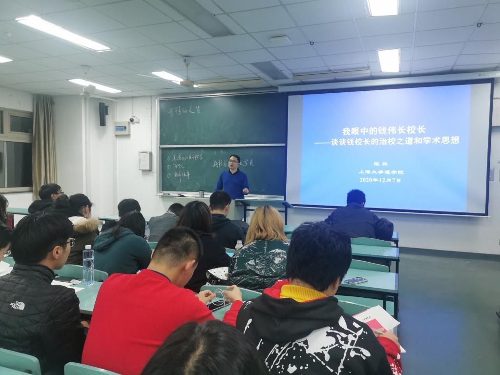 此外,陈然老师还介绍了钱伟长老校长的主要学术成就和办学成绩:钱老有极其丰富的科研成果:板壳内禀理论;张量分析、微分几何与弹性理论分糅合;独特的拖带坐标系的选定;三维微元体的剖析等。陈然老师阐明钱伟长老校长进行科研工作的特点:吃透前人成果;不拘泥于成法,直观想象领路;敏锐与严谨并重。作为校长,他创新提出“拆四堵墙”的教育改革思路;确定“自强不息,先天下之忧而忧,后天下之乐而乐”为永利集团88304官网校训;他的大师风范,爱国情怀、勤奋进取,锐意创新激励着在座的每一位同学。虽然钱伟长老校长并不是党员,但他却更像是一个党员,具有先进的思想,具有浓烈家国情怀,具有无私奉献的精神。作为一名蜚声国内外的科学大家,钱老仍能做到坚守初心,说真话,做实事,不断创新进取,难能可贵。通过介绍钱伟长老校长的奋斗历史,让同学们更深入地了解了上大的历史,了解了青年人应当志存高远,以国家发展、民族复兴为己任,秉承校训自强不息,先天下之忧而忧,后天下之乐而乐!