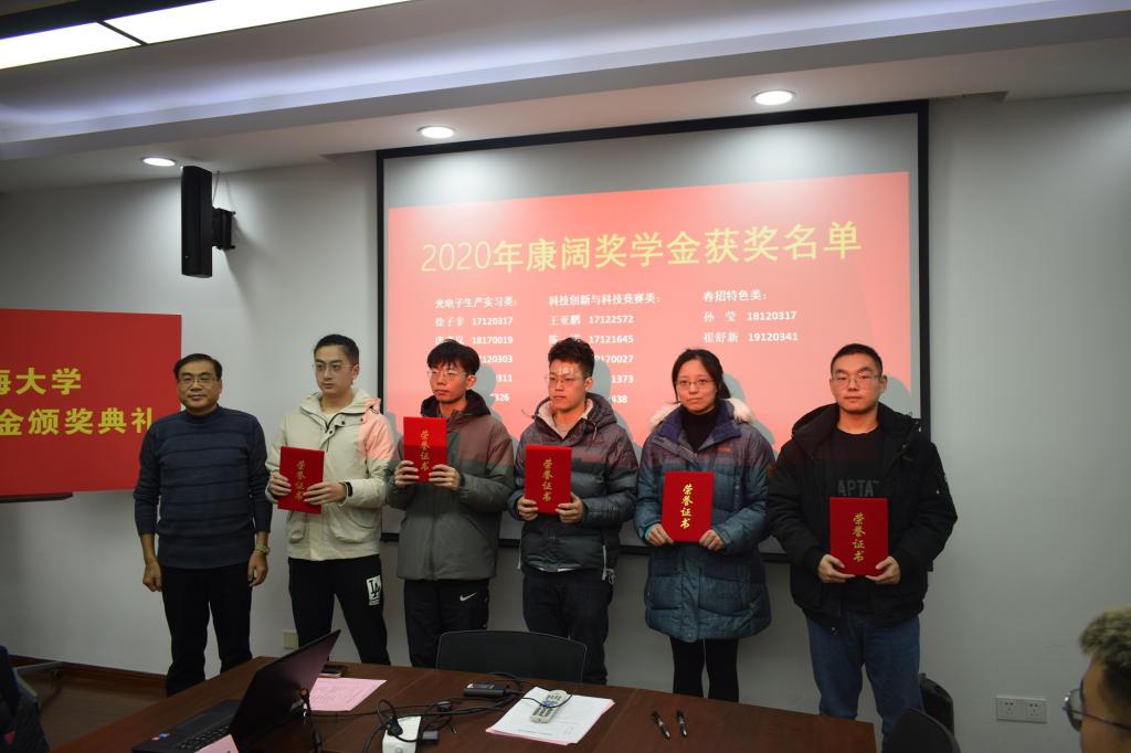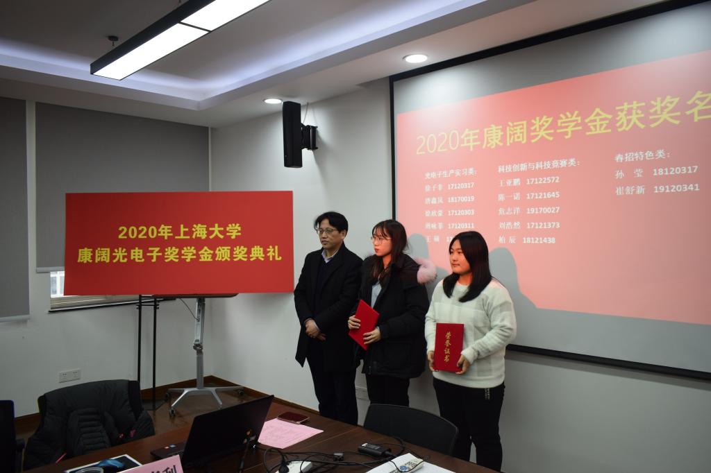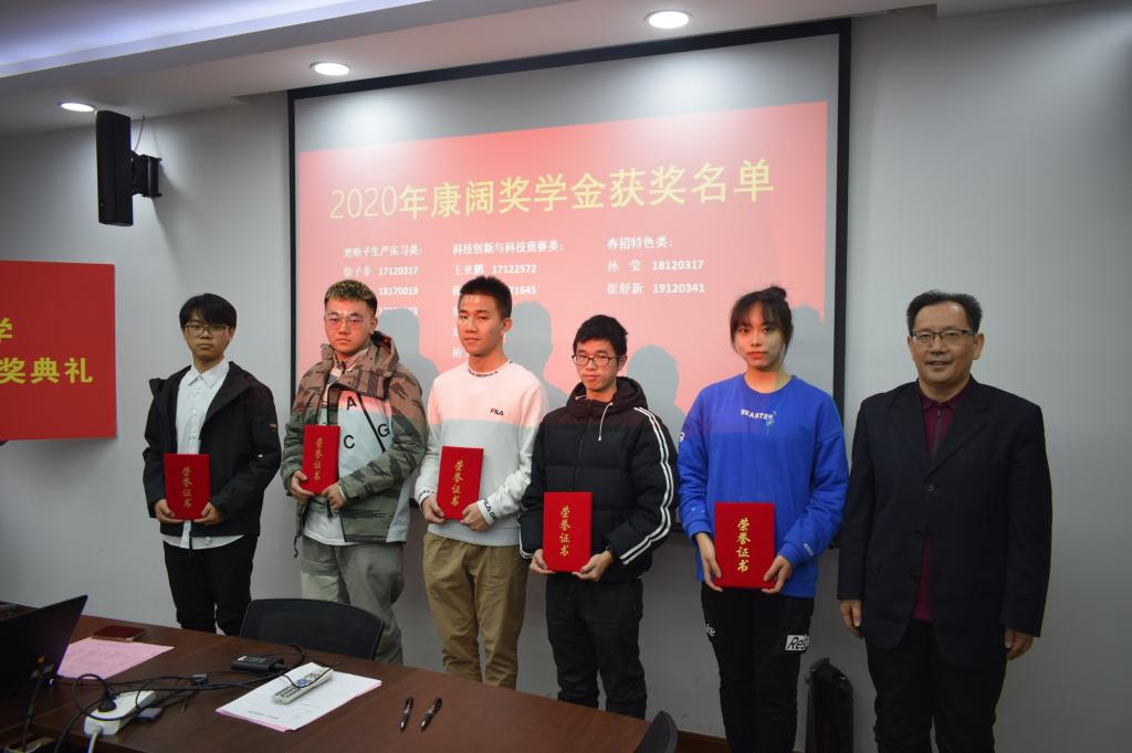 永利集团88304官网党委副书记姚颖冲宣读了2020永利集团88304官网康阔光电子实习奖学金获奖名单,并由黄勇先生、盛万成书记、蔡传兵主任分别为获得生产实习类、科技创新与竞赛类和春招特色类的同学颁发了荣誉证书。