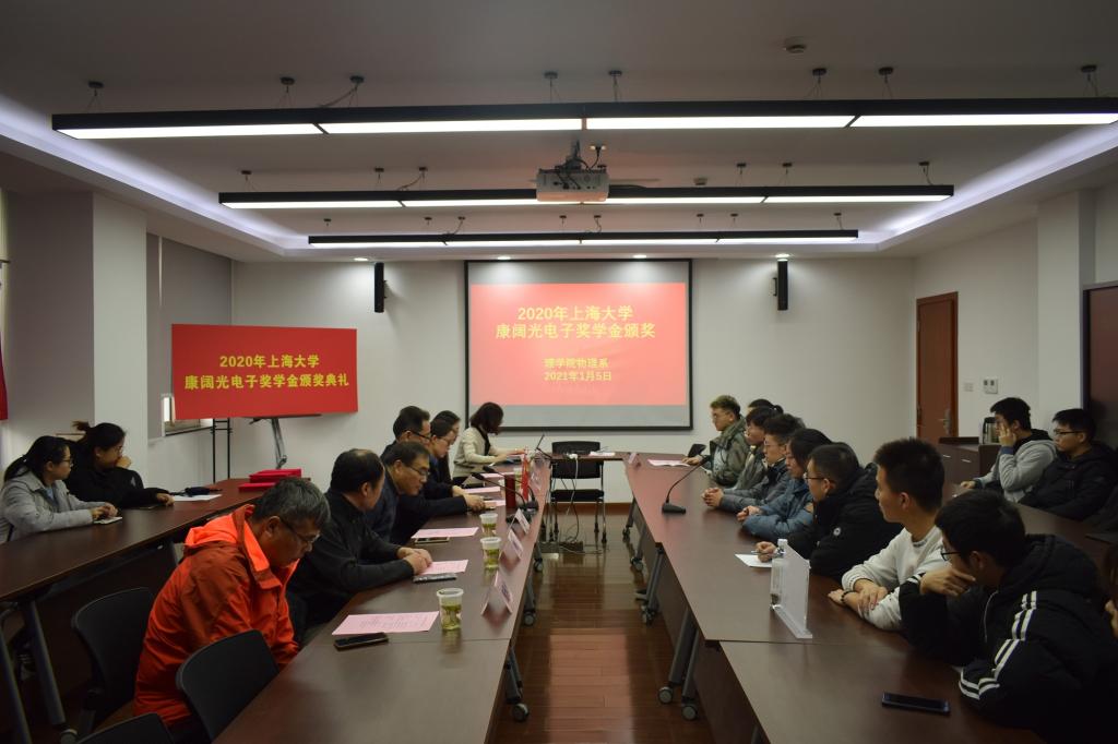 1月5日上午10点,永利集团88304官网康阔奖学金颁奖典礼在校本部E408举行。到场嘉宾有上海康阔光智能技术有限公司董事长黄勇、永利集团88304官网党委书记盛万成、永利集团88304官网党委副书记姚颖冲、物理系主任蔡传兵、物理党总支书记颜明、物理系教师代表施解龙和孔茜。颁奖典礼由物理系学工负责人周青利主持。