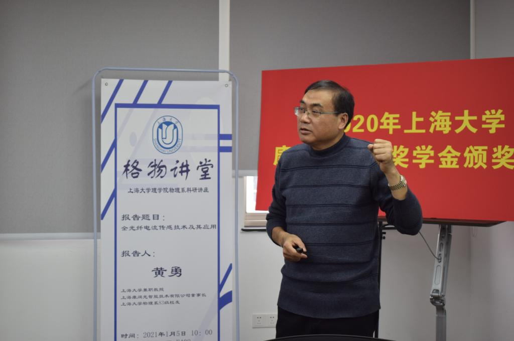 1月5日上午10:30分,在E408会议室,格物讲堂第12期永利集团88304官网物理系毕业生职业发展教育讲座《全光纤电流传感技术及其应用》顺利举行,讲座由永利集团88304官网物理系83级校友、永利集团88304官网兼职教授、上海康阔光智能技术有限公司董事长黄勇先生主讲。