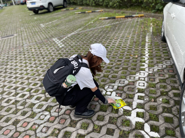 炎炎夏日中,党支部志愿者准时到达溯园,集合开展志愿活动。其中一位志愿者提前备好了清洁校园时所使用的一次性手套,沿着遡园草坪往校内寻找刺目的白色垃圾,进行整理清洁工作。