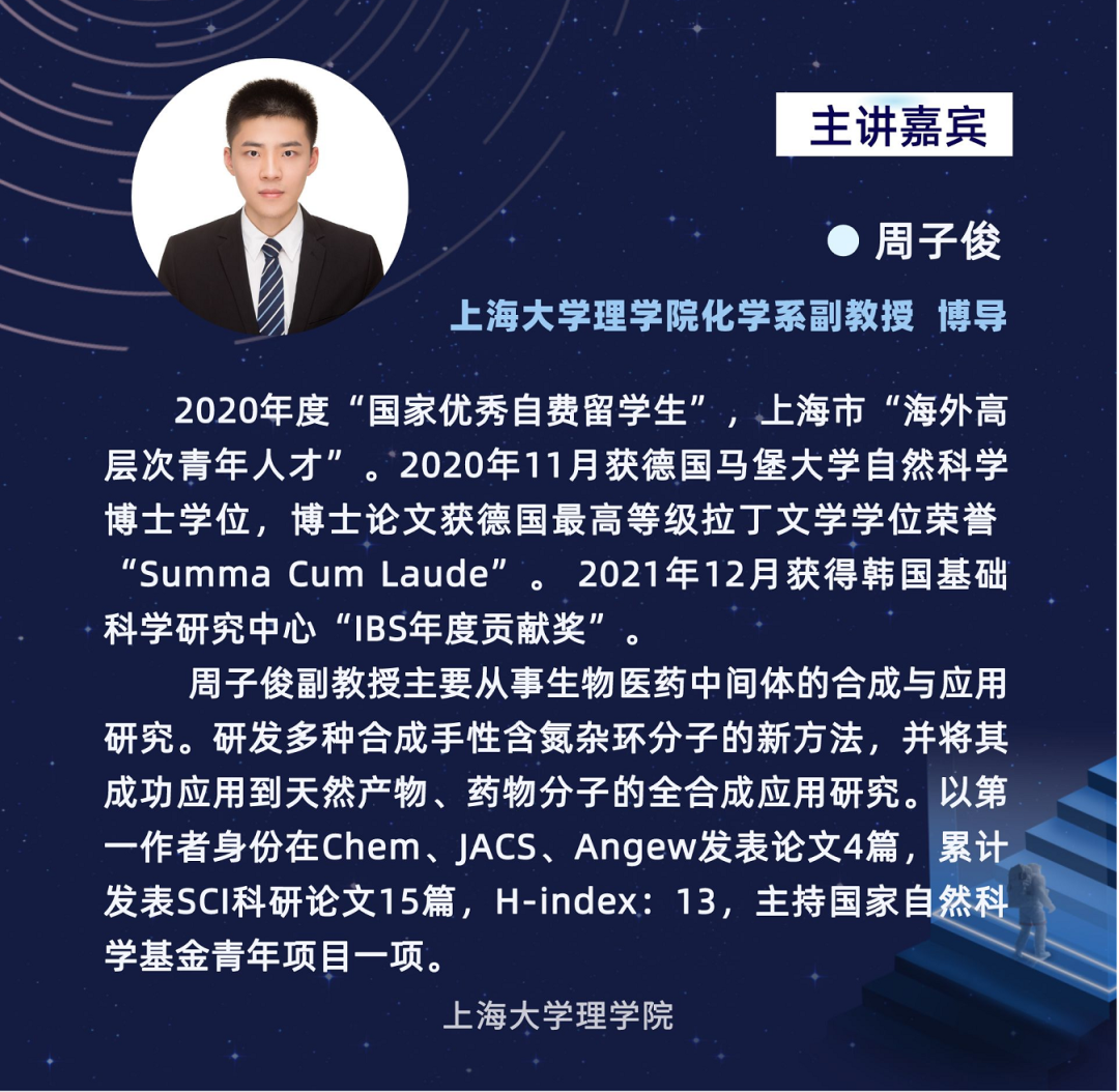 为拓宽学术视野,锻炼科研精神,提高学生的科研能力,10月19日晚上七点半,在永利集团88304官网党委的指导下,遵守疫情防控措施,永利集团88304官网在线上腾讯会议以及嘉定校区2教201举办永利集团88304官网青教讲堂暨标杆讲座系列“寻找科研与生活的契合点”。永利集团88304官网副教授周子俊主讲题为“我的学生时代:寻找科研与生活的契合点”的专题讲座。本次活动出席的嘉宾老师2022级研究生辅导员老师魏宛辰。本次讲座由永利集团88304官网化学系研究生薛雅宁主持。百余名永利集团88304官网研究生参加了本次线上讲座。