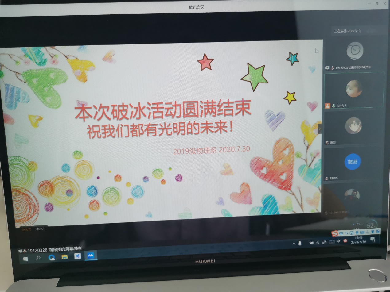 不知不觉时间过了两个半小时,最后在辅导员为同学们说明寝室分配等事宜之后,19级物理系班级在线破冰暨导生见面会活动顺利拉下了帷幕。