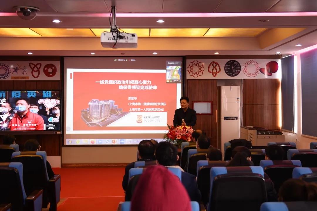 在战火纷飞的革命年代,牺牲就是舍弃自己的生命,在建设社会主义的和平年代,牺牲除了用生命做代价外,还有更为丰富的内涵,上海援鄂医疗队除夕夜白衣执甲,逆行武汉,奔赴战场。“不计报酬、无论生死”,不单是对个人利益的牺牲、对家庭亲情的牺牲,也是对生命健康的牺牲。郑军华教授讲到援鄂医务人员克服了物资缺乏、治疗困难、院内感染高等一系列困难完成使命,他们用行动践行誓言,牺牲小我,成就大我,展现了无私奉献的伟大精神。在播放医疗队在金银潭医院的纪录短片,回想起之前的经历,郑军华教授几经落泪。