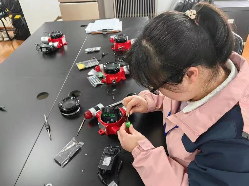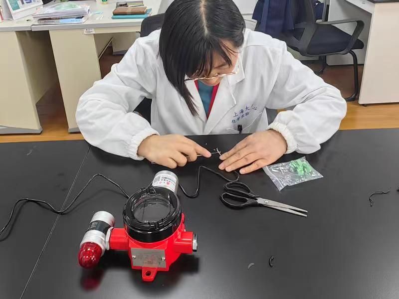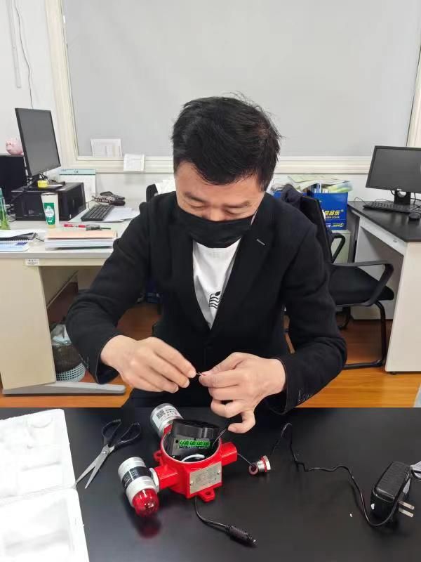 在氧气浓度报警器的安装和调试中,化学系安全员何伟民和王冠两位老师全程给予技术指导。化学系副主任、化学实验教学中心常务副主任丁益民不顾工作繁忙,一起投入到报警器的组装工作中。在电源线接入报警器主机时,原电源线的红线需接主机模块的正极,白线接模块的负极,党员老师们相互协作,细心的老师帮忙去掉铜线外的皮圈,力气大的老师帮忙拧紧螺丝,旋紧面盖。大家相互检验正负极的接线位置以及安装顺序,确保一台台氧气浓度报警器通电后都能正常启动和运行,方便老师们领回去后即插即用,保障实验室气体浓度监测安全。