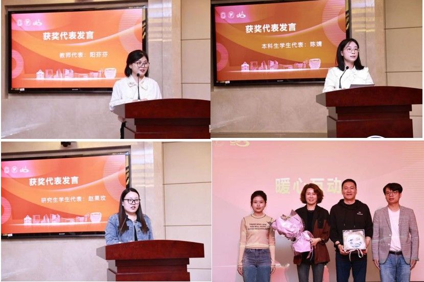 获奖教师代表阳芬芬、学生代表赵果玫、陈婧分别发表了获奖感言,表达了对郭玮、徐海珍伉俪慷慨捐赠的感谢,分享了个人在科研、工作与学习中的感想和成果,他们表示要更加专注地投入学习、实践、研究,不辜负阳阳教育基金设立的初心,抱有终身学习的态度,为数学学科的建设与发展做出更大贡献。获奖师生代表为郭玮、徐海珍伉俪送上一份由获奖师生设计的礼物作为纪念,以表感激之情。