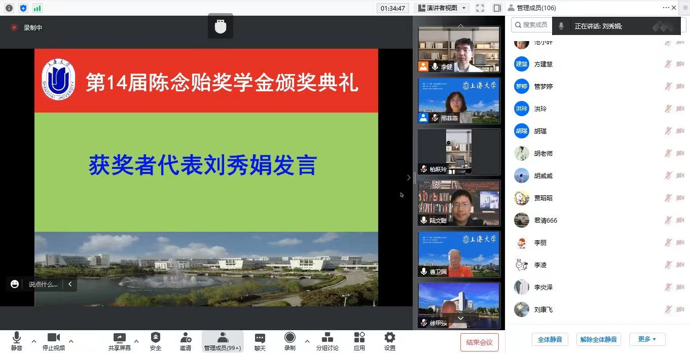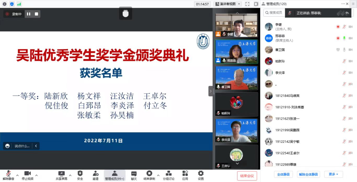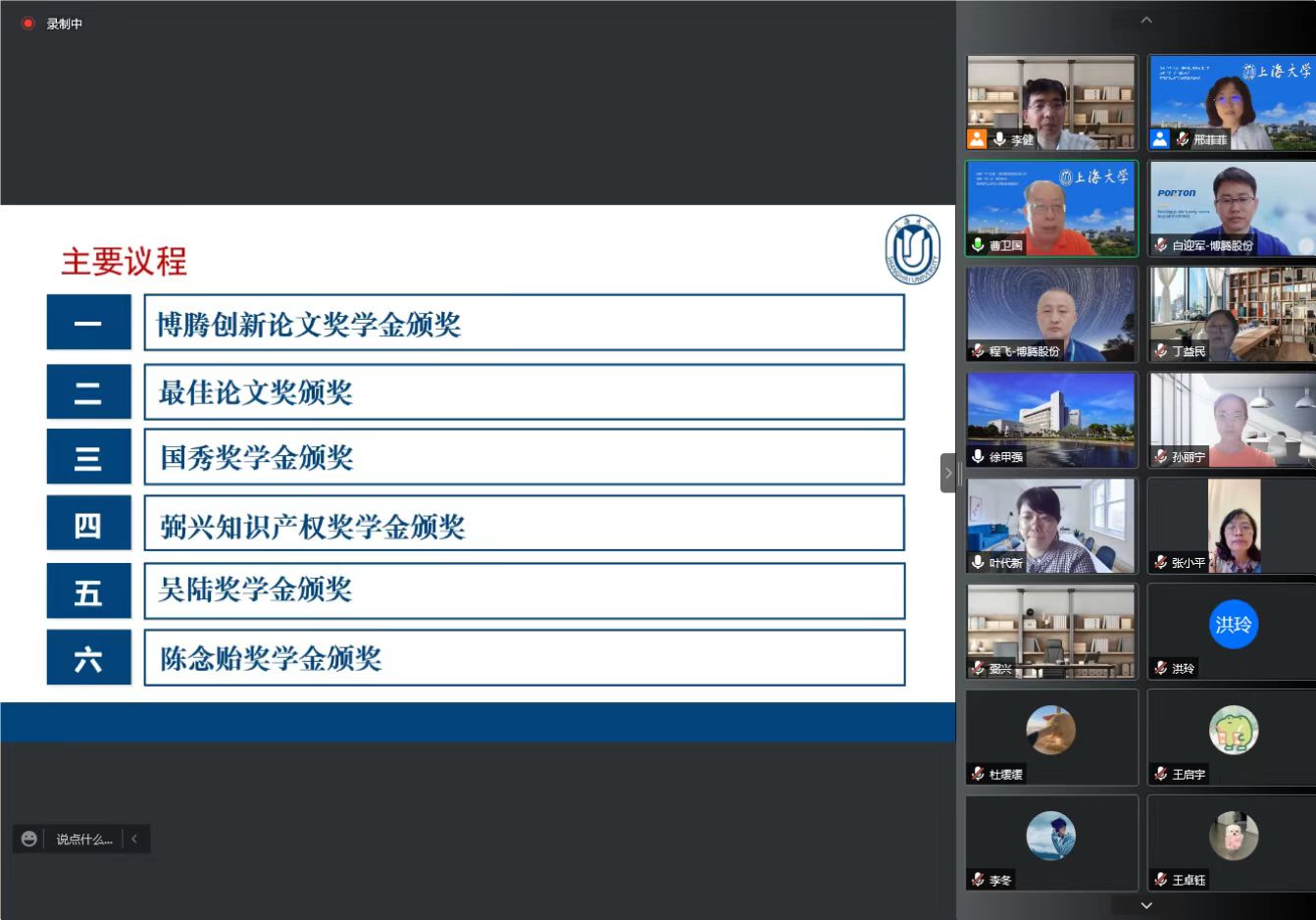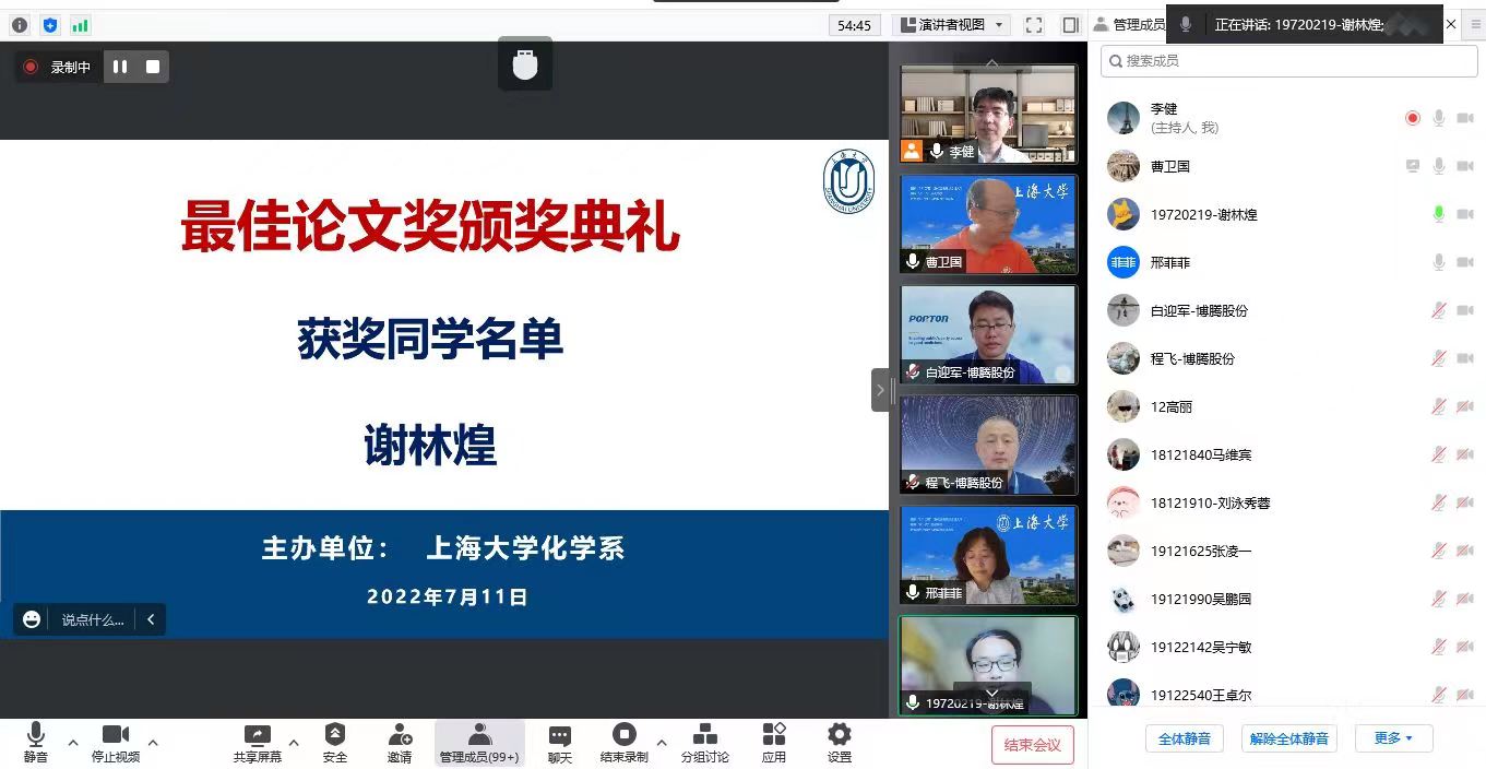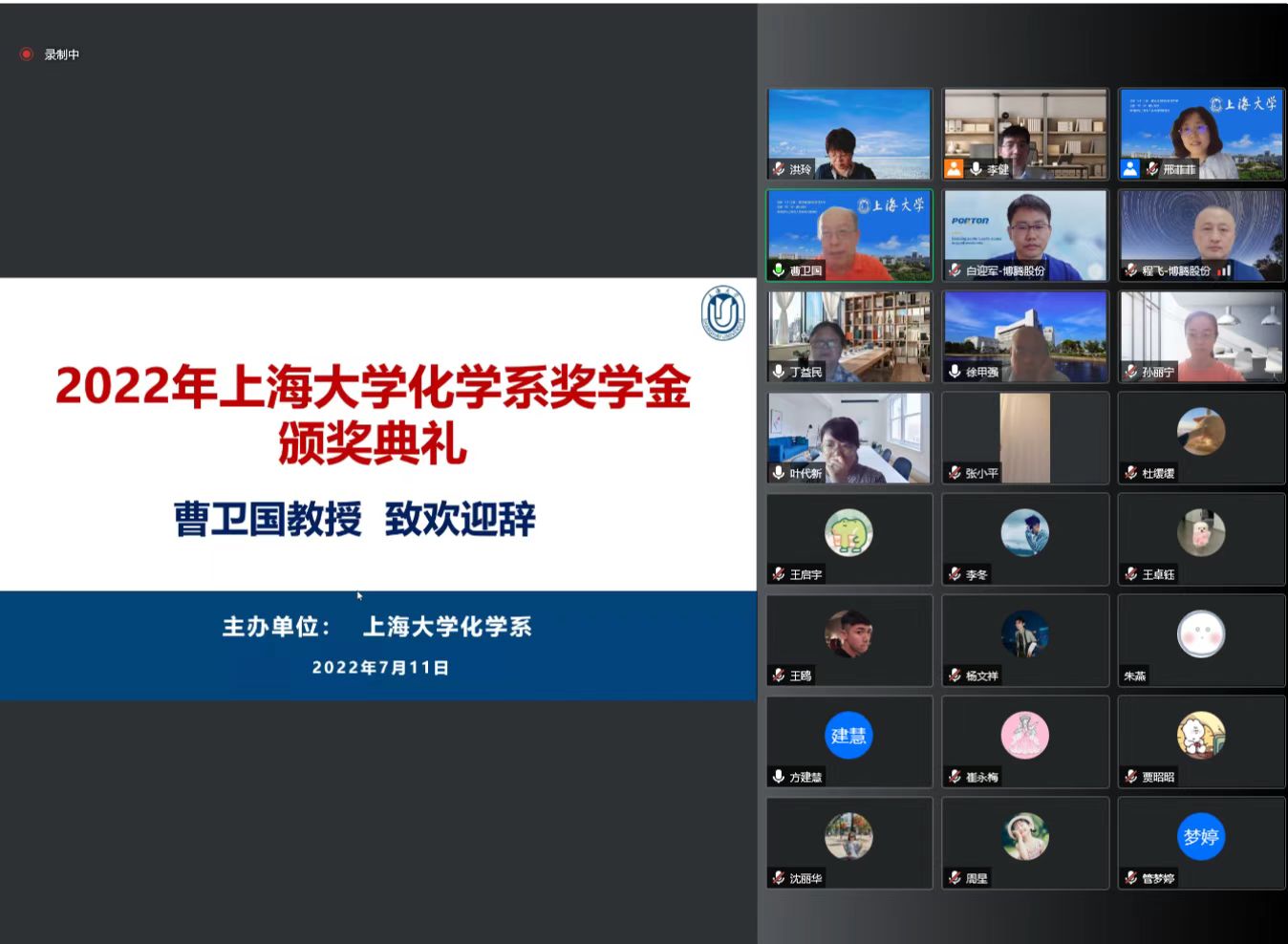7月11日下午,永利集团88304官网化学系奖学金颁奖仪式在线上隆重举行。博腾股份有限公司SMP副总经理白迎军、事业部人力资源负责人程飞、上海弼兴律师事务所高级合伙人王卫彬、徐婕超、永利集团88304官网副院长徐甲强,化学系党政领导班子、化学系教授陈雅丽、陆文聪、获奖导师方建慧、严六明、龚和贵、王洪宇、崔永梅、柏跃玲等、本科生、研究生、研究生导师、班导师近160人线上参加了活动。化学学科党总支书记邢菲菲主持仪式。