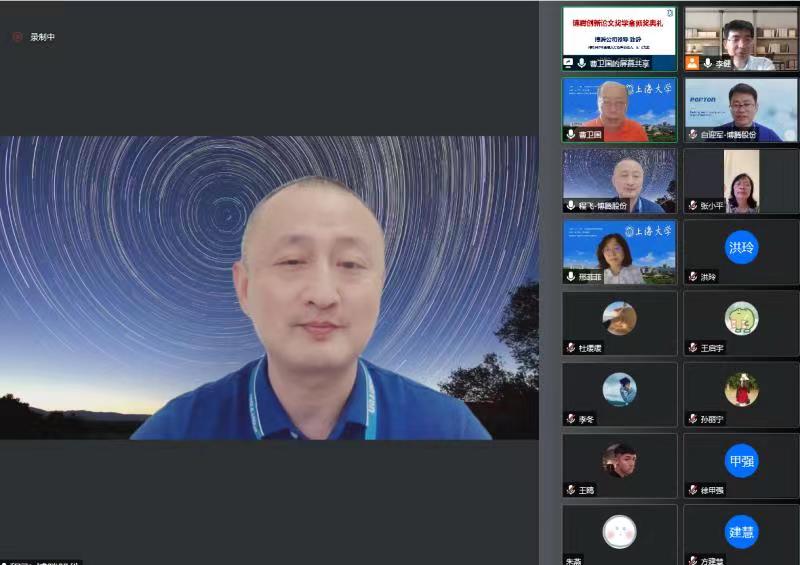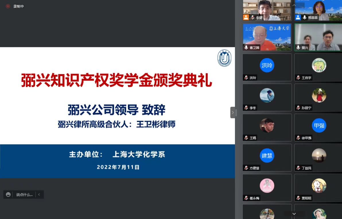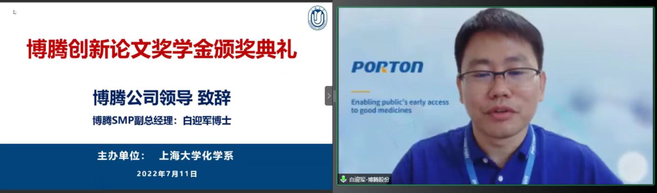 两项校企合作奖学金也隆重揭晓——首届博腾创新论文奖学金和第二届弼兴知识产权奖学金。化学系一向重视校企合作,深化人才培养,分别与博腾股份有限公司、上海弼兴律师事务所签署了校企合作协议,在产学研一体化、人才培养等方面开展深度合作,两家企业都捐资设立奖学金。今年,化学系共10名研究生获博腾创新论文奖学金,10名研究生导师获博腾创新论文导师奖;1名本科生、3名研究生获弼兴知识产权奖学金。会上,博腾SMP副总经理白迎军简介了公司概况,肯定了校企合作的丰硕成果。博腾SMP事业部人力资源负责人程飞作为永利集团88304官网校友,介绍了公司人才战略,欢迎广大应届生加入公司。弼兴律所高级合伙人王卫彬希望通过奖学金播下知识产权的种子,欢迎化学学子应聘该律所,在法律工作中学以致用、大展身手。获奖同学感恩化学系和导师的培养,感谢校友企业的大力支持。博腾创新论文奖学金获奖研究生代表龙红利表示:“感到身上肩负的责任和使命,毕业后将时刻牢记我是上大人,奉献社会为上大增光,为化学系添彩。”获奖导师代表祝贺获奖同学,并寄语同学们在奋斗中书写青春华章。