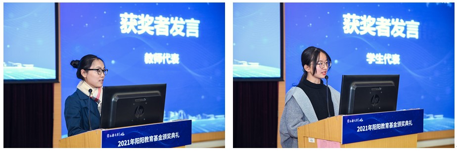 颁奖过后,师生获奖代表发言。数学系青年教师潘晓敏老师感谢郭玮徐海珍伉俪的支持,表示这次获奖是对过去工作的肯定,并会不断努力前进。数学系2020级本科生鲁心园同学表示这份奖学金是一份激励与祝福,也是一份传承与责任,未来将会带着这份鼓励和希冀去探索、去突破,去发展和改变这个世界,去体验数学之美、探索之美、发现之美。